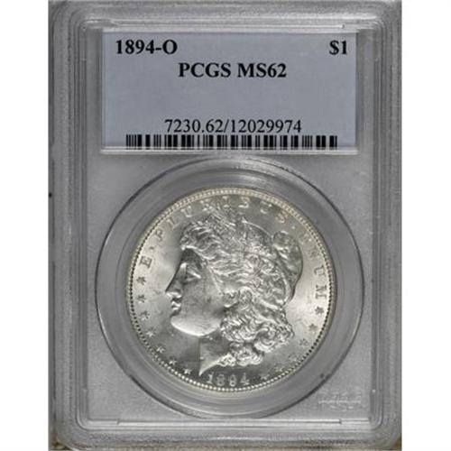 <B>1894-O $1 MS62 PCGS.</B></I> Softly struck in the centers, with essentially untoned silvery-gray surfaces that are highly lustrous. A few shallow marks on the obverse limit the grade, along with the typical weak strike. A conditionally desirable issue in Mint State. <BR><BR><B>Coin Engraver:</B> George T. Morgan<BR><BR><b>Shipping:</b> Coins & Currency (<a target="_blank" href="http://www.heritageauctions.com/common/shipping.php">view shipping information</a>)