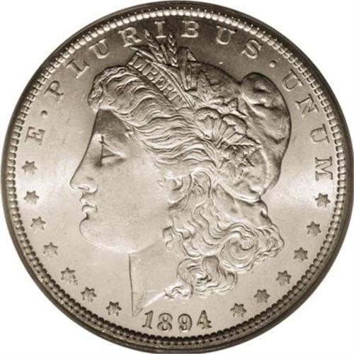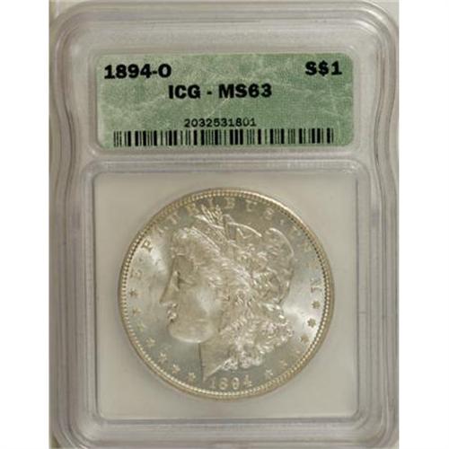 <B>1894-O $1 MS63 ICG.</B></I> The untoned silver-gray surfaces are highly lustrous, showing flashy cartwheels on each side. There is only a trace of weakness above Liberty's ear, and on the eagle's breast feathers. A few minor marks and luster grazes are noted in the fields, and on Liberty's cheek. According to Dave Bowers (1993): "The 1894-O is fairly scarce in Mint State. When encountered, specimens are nearly always poorly struck." This boldly struck Select Mint State piece is an exception. <BR><BR><B>Coin Engraver:</B> George T. Morgan<BR><BR><b>Shipping:</b> Coins & Currency (<a target="_blank" href="http://www.heritageauctions.com/common/shipping.php">view shipping information</a>\)