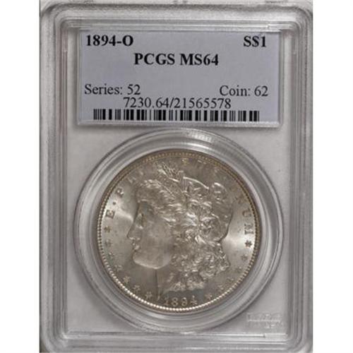 <B>1894-O $1 MS64 PCGS.</B></I> A lovely better date Morgan dollar, with an overlay of light lilac patina. Booming luster electrifies smooth surfaces that have just a few too many shallow abrasions on the cheek to allow for a Gem grade. As usual for the 1894-O, the centers are incomplete, but the remainder of the design is crisp. A scant eight pieces have been certified finer by PCGS (11/07).<BR><I>From The Motor City Collection.</B></I><BR><BR><B>Coin Engraver:</B> George T. Morgan<BR><BR><b>Shipping:</b> Coins & Currency (<a target="_blank" href="http://www.heritageauctions.com/common/shipping.php">view shipping information</a>)