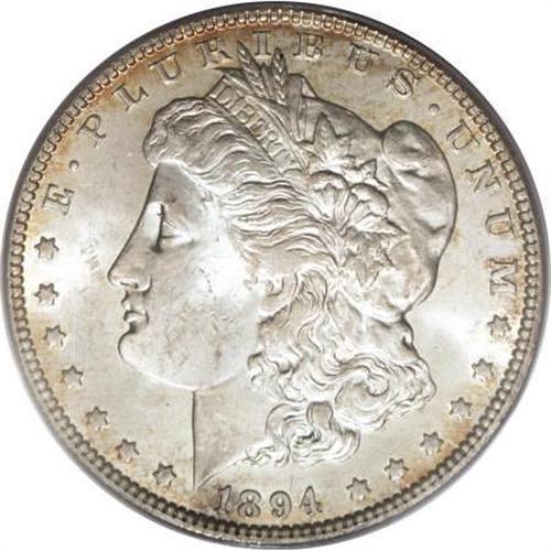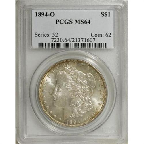 <B>1894-O $1 MS64 PCGS.</B></I> Golden-brown, lilac, and cobalt-blue adorn the reverse, while the obverse provides peripheral sun-gold toning. The fields of this difficult date Morgan dollar are refreshingly unperturbed, and the cheek displays only moderate contact. The centers are slightly soft, characteristic of the issue. PCGS has certified just eight pieces finer (1/08). <BR><I>From The Jimmy G. PCGS Registry Collection of Morgan Dollars with Varieties.</B></I><BR><BR><B>Coin Engraver:</B> George T. Morgan<BR><BR><b>Shipping:</b> Coins & Currency (<a target="_blank" href="http://www.heritageauctions.com/common/shipping.php">view shipping information</a>)