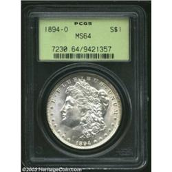 <TR><TD width="100%"><TABLE cellSpacing=1 cellPadding=3 width="100%" border=0><TBODY><TR><TD width="100%" bgColor=#79735c><FONT face=arial color=#ffffff size=3><B>Description</B> </FONT></TD></TR><TR><TD width="100%" bgColor=#ffffff><FONT face=arial size=2><B>1894-O $1 MS64 PCGS.</B></I> Untoned with thick, satiny luster in the pristine fields and a strong strike for this notoriously weak New Orleans issue. Only the presence of a few minor luster grazes on Liberty's cheekbone and above her eye spoil the chances for a Gem rating. Still, one of the nicest '94-O Morgans we have seen. </FONT></TD></TR></TBODY></TABLE></TD></TR></TBODY></TABLE><BR><A name=PricesRealized></A><TABLE cellSpacing=0 cellPadding=0 width="100%" bgColor=#000000 border=0><TBODY><TR><TD width="100%"><TABLE cellSpacing=1 cellPadding=3 width="100%" border=0><TBODY><TR><TD width="100%" bgColor=#79735c><A name=PR><FONT face=arial color=#ffffff size=3><B>Previous Prices from Heritage Auctions</B> </FONT></A></TD></TR><TR><TD bgColor=#f6f6ed><TABLE cellSpacing=0 cellPadding=0 width="100%" border=1><TBODY><TR><TD align=middle width="33%"><B>Date</B></TD><TD align=middle width="33%"><B>Service</B></TD><TD align=middle width="33%"><B>Price</B></TD></TR><TR bgColor=whitesmoke><TD width="33%"><B>03/23/2003</B></TD><TD width="33%">PCGS</TD><TD width="33%">$5,175.00</TD></TR><TR bgColor=whitesmoke><TD width="33%"><B>02/16/2000</B></TD><TD width="33%">PCGS</TD><TD width="33%">$4,945.00</TD></TR><TR bgColor=whitesmoke><TD width="33%"><B>01/01/2001</B></TD><TD width="33%">PCGS</TD><TD width="33%">$4,830.00</TD></TR><TR bgColor=whitesmoke><TD width="33%"><B>08/06/2001</B></TD><TD width="33%">PCGS</TD><TD width="33%">$4,025.00</TD></TR><TR bgColor=whitesmoke><TD width="33%"><B>04/27/2002</B></TD><TD width="33%">PCGS</TD><TD width="33%">$5,175.00</TD></TR><TR bgColor=whitesmoke><TD width="33%"><B>11/19/1999</B></TD><TD width="33%">PCGS</TD><TD width="33%">$4,312.50</TD></TR><TR bgColor=whitesmoke><TD width="33%"><B>01/05/2001</B></TD><TD width="33%">PCGS</TD><TD width="33%">$4,255.00</TD></TR><TR bgColor=whitesmoke><TD width="33%"><B>06/07/2000</B></TD><TD width="33%">PCGS</TD><TD width="33%">$4,255.00</TD></TR><TR bgColor=whitesmoke><TD width="33%"><B>09/22/1999</B></TD><TD width="33%">PCGS</TD><TD width="33%">$4,500.00</TD></TR><TR bgColor=whitesmoke><TD width="33%"><B>08/13/1999</B></TD><TD width="33%">PCGS</TD><TD width="33%">$5,405.00</TD></TR><TR bgColor=whitesmoke><TD width="33%"><B>06/01/1997</B></TD><TD width="33%">PCGS</TD><TD width="33%">$5,390.00</TD></TR><TR bgColor=whitesmoke><TD width="33%"><B>01/01/1997</B></TD><TD width="33%">PCGS</TD><TD width="33%">$5,500.00</TD></TR><TR bgColor=whitesmoke><TD width="33%"><B>01/11/2003</B></TD><TD width="33%">NGC</TD><TD width="33%">$3,795.00</TD></TR><TR bgColor=whitesmoke><TD width="33%"><B>02/23/2002</B></TD><TD width="33%">NGC</TD><TD width="33%">$3,220.00</TD></TR><TR bgColor=whitesmoke><TD width="33%"><B>02/12/2000</B></TD><TD width="33%">NGC</TD><TD width="33%">$3,795.00</TD></TR><TR bgColor=whitesmoke><TD width="33%"><B>11/30/1999</B></TD><TD width="33%">NGC</TD><TD width="33%">$3,900.00</TD></TR><TR bgColor=whitesmoke><TD width="33%"><B>12/14/1999</B></TD><TD width="33%">NGC</TD><TD width="33%">$4,000.00</TD></TR><TR bgColor=whitesmoke><TD width="33%"><B>11/18/1999</B></TD><TD width="33%">NGC</TD><TD width="33%">$6,900.00</TD></TR><TR bgColor=whitesmoke><TD width="33%"><B>05/05/2000</B></TD><TD width="33%">NGC</TD><TD width="33%">$3,910.00</TD></TR><TR bgColor=whitesmoke><TD width="33%"><B>11/01/1995</B></TD><TD width="33%">NGC</TD><TD width="33%">$3,080.00</TD></TR><TR bgColor=whitesmoke><TD width="33%"><B>01/01/1999</B></TD><TD width="33%">NGC</TD><TD width="33%">$5,060.00</TD></TR><TR bgColor=whitesmoke><TD width="33%"><B>08/02/1997</B></TD><TD width="33%">ANACS</TD><TD width="33%">$16,675.00</TD></TR></TBODY></TABLE></TD></TR><TR><TD bgColor=#ffffff><FONT face=arial size=1 ?>PLEASE NOTE: All prices realized reflect the final hammer price PLUS the buyer's premium in auctions that charge a buyer's premium. Each item has a notation at the top of the listing indicating whether that lot included a buyer's premium. Example: A item that sells with a final hammer price of $100 and a 20% buyer's premium will display with a price realized of $120. All information listed is intended to be as accurate as possible, but errors are possible. Please use this guide carefully and inform us of any inaccuracies. </FONT></TD></TR></TBODY></TABLE></TD></TR></TBODY></TABLE><BR><TABLE cellSpacing=0 cellPadding=0 width="100%" bgColor=#000000 border=0><TBODY><TR><TD width="100%"><TABLE cellSpacing=1 cellPadding=3 width="100%" border=0><TBODY><TR><TD width="100%" bgColor=#79735c colSpan=6><FONT face=arial color=#ffffff size=3><B>Price Guide*</B> </FONT></TD></TR><TR bgColor=#f6f6ed><TD align=middle><B>Grade</B> </TD><TD align=middle><B>Coin World<BR>(Trends)</B> </TD><TD align=middle><B>Numismedia<BR>Retail</B> </TD><TD align=middle><B>Numismedia<BR>Wholesale</B> </TD><TD align=middle><B>Coin<BR>Universe</B> </TD><TD align=middle><B>Heritage<BR>Value Index</B> </TD></TR><TR bgColor=#ffffff><TD align=middle>63</TD><TD align=right>$3,150.00</TD><TD align=right>---</TD><TD align=right>$2,300.00</TD><TD align=right>$3,250.00</TD><TD align=right>$2,125.00</TD></TR><TR style="FONT-WEIGHT: bold" bgColor=#cccfdd><TD align=middle>64</TD><TD align=right>$6,750.00</TD><TD align=right>---</TD><TD align=right>$4,325.00</TD><TD align=right>$6,850.00</TD><TD align=right>$4,810.00</TD></TR><TR bgColor=#ffffff><TD align=middle>65</TD><TD align=right>$45,000.00</TD><TD align=right>---</TD><TD align=right>$41,500.00</TD><TD align=right>$48,500.00</TD><TD align=right>$32,616.67</TD></TR><TR bgColor=#ffffff><TD colSpan=6><FONT size=1>*All information listed is intended to be as accurate as possible, but errors are possible. No item may be returned or refused based on this information which is provided as a service to ou