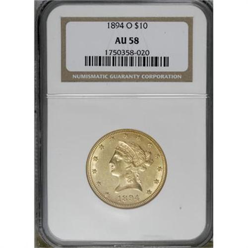 <B>1894-O $10 AU58 NGC.</B></I> . NGC Census: (240/237). PCGS Population (62/162). Mintage: 107,500. Numismedia Wsl. Price for NGC/PCGS coin in AU58: $465. (#8730)<BR><BR><B>Coin Engraver:</B> Christian Gobrecht<BR><BR><b>Shipping:</b> Coins & Currency (<a target="_blank" href="http://www.heritageauctions.com/common/shipping.php">view shipping information</a>)