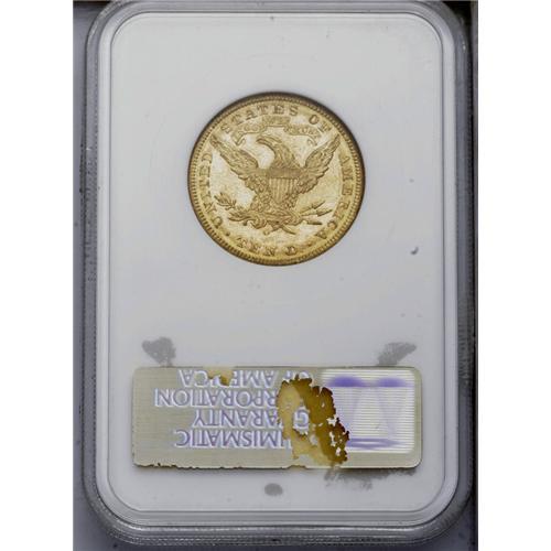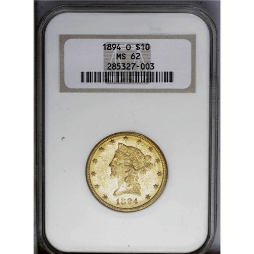 <B>1894-O<$10> MS62 NGC.</B></I> An original honey-gold New Orleans ten, housed in a prior generation holder. Well struck in the centers, although a few stars are soft. Marks are distributed but none merit mention. Scarcer in Mint State than implied by the mintage of 107,500 pieces. Census: 42 in 62, 13 finer (3/06). <BR><BR><B>Important notice:</B> Heritage usually auctions material at the rate of 200-250 lots per hour. On some occasions eBay Live bid software or the Internet may not be able to keep up with the pace of the auction. We recommend placing a realistic absentee bid now as insurance to avoid disappointment. Occasionally the auctioneer may eliminate or reject an eBay Live bid, and the auctioneer may also reopen a lot after the close of the eBay live bidding (usually because we missed an audience bid), and may reject your bid even if it shows you as the winning bidder. By bidding via eBay Live, you agree that Heritage may award the lot to another bidder at its sole discretion under the circumstances described above or any other reasonable circumstances. Since eBay bids are not shown to us until we open the lot on the floor, we treat those bids just like floor bids. In most cases the floor responds before the eBay bid is presented to us, due to Internet lag time, so for consistency we have made it a policy that floor bids are always considered first over tie eBay live bids. Also please note that all Heritage lots purchased through eBay Live carry a 20% Buyer's Premium. Please make sure you read the Terms and Conditions before you bid. This lot is being auctioned in conjunction with a live floor auction by Heritage Galleries & Auctioneers. All final auction and invoice information will be supplied by Heritage Galleries & Auctioneers, and all other information should be considered preliminary. Lot:4048 <BR><BR><B>Winning Notification and Billing:</B> After the FINAL session in this auction is complete, Heritage will send e-mail and snail mail invoices. This process normally takes several days. All final auction and invoice information will be supplied by Heritage Galleries & Auctioneers, and all other information should be considered preliminary. <BR><BR>This auction will be conducted on a live auction floor and over the Internet through eBay Live. If you choose to place an absentee bid, please take a moment to <font color='#0000ff'><u><a href='http://pages.ebay.com/liveauctions/help/before/laabsentee.html'>learn how eBay Live absentee bidding works</a></u></font><font color='#000000'>