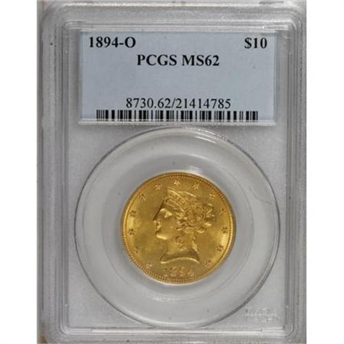 <B>1894-O $10 MS62 PCGS.</B></I> This New Orleans ten issue is much scarcer than its mintage suggests, particularly when compared with its 1893-O predecessor. Well struck and only lightly abraded with slightly diminished obverse luster.<BR><BR><B>Coin Engraver:</B> Christian Gobrecht<BR><BR><b>Shipping:</b> Coins & Currency (<a target="_blank" href="http://www.heritageauctions.com/common/shipping.php">view shipping information</a>)