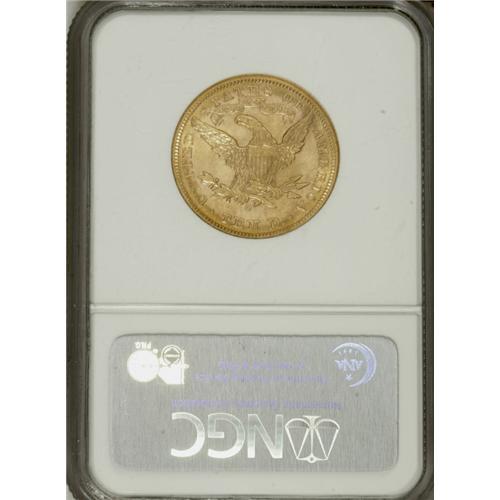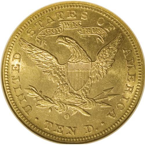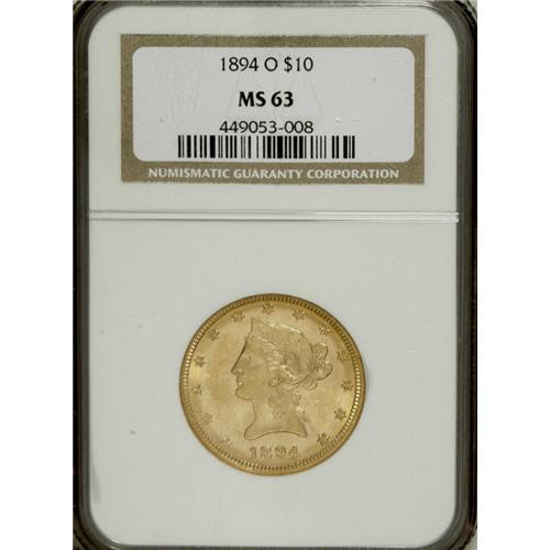 <B>1894-O $10 MS63 NGC.</B></I> While Winter indicates that hundreds of high About Uncirculated and lower Mint State pieces are available today, Select and finer examples remain elusive. This appealing piece has plenty of positive facets, including solid overall detail and luster that is more vibrant than that of the typical example. Most of the coin has wheat-gold color, but a ring of orange appears on each side, just within the rim. The surfaces have light abrasions, though they are more visible in the fields than on the devices. Census: 12 in 63, 2 finer (2/07).<BR><BR><b>Shipping:</b> Coins & Currency (<a target="_blank" href="http://www.heritageauctions.com/common/shipping.php">view shipping information</a>)
