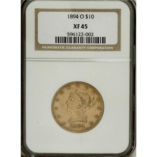 <B>1894-O $10 XF45 NGC.</B></I> NGC Census: (18/583). PCGS Population (28/332). Mintage: 107,500. Numismedia Wsl. Price: $330. (#8730)<BR><BR><b>Shipping:</b> Coins & Currency (<a target="_blank" href="http://www.heritageauctions.com/common/shipping.php">view shipping information</a>)