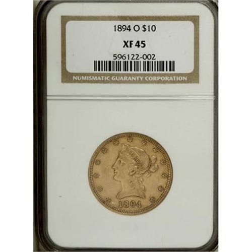 <B>1894-O $10 XF45 NGC.</B></I> NGC Census: (19/604). PCGS Population (28/340). Mintage: 107,500. Numismedia Wsl. Price for NGC/PCGS coin in XF45: $339. (#8730)<BR><BR><B>Coin Engraver:</B> Christian Gobrecht<BR><BR><b>Shipping:</b> Coins & Currency (<a target="_blank" href="http://www.heritageauctions.com/common/shipping.php">view shipping information</a>\)