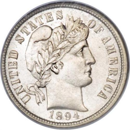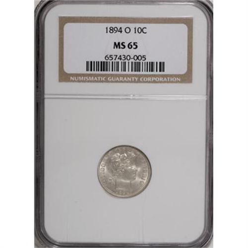 <B>1894-O 10C MS65 NGC.</B></I> The 1894-O Barber dime is scarce and desirable in this lofty grade, one of the real series rarities. According to David and John Feigenbaum's <I>Complete Guide to Certified Barber Coinage, </B></I>"The 1894-O is one of the most difficult dates to find in mint state," assigning it an R.6 rarity rating. This coin is boldly struck throughout, lacking only the slightest details on LIBERTY and the lower part of the reverse wreath. The sparkling surfaces are virtually untoned, with good luster and ample eye appeal. <BR> The surfaces are a delight to behold, with nary a mentionable contact mark to be found, even with a strong glass. The paltry mintage of 720,000 pieces accounts for the rarity of this date in Gem. A foremost condition rarity that will please even the most demanding collector, and a prize to acquire. Census: 2 in 65, 1 finer (1/08).<BR><I>From The Southwest Collection.</B></I><BR><BR><B>Coin Engraver:</B> Charles E. Barber<BR><BR><b>Shipping:</b> Coins & Currency (<a target="_blank" href="http://www.heritageauctions.com/common/shipping.php">view shipping information</a>)