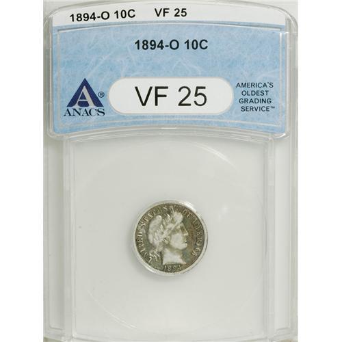 <B>1894-O 10C VF25 ANACS.</B></I> NGC Census: (0/54). PCGS Population (0/62). Mintage: 720,000. Numismedia Wsl. Price: $237. (#4804)<BR><BR><b>Shipping:</b> Coins & Currency (<a target="_blank" href="http://www.heritageauctions.com/common/shipping.php">view shipping information</a>)