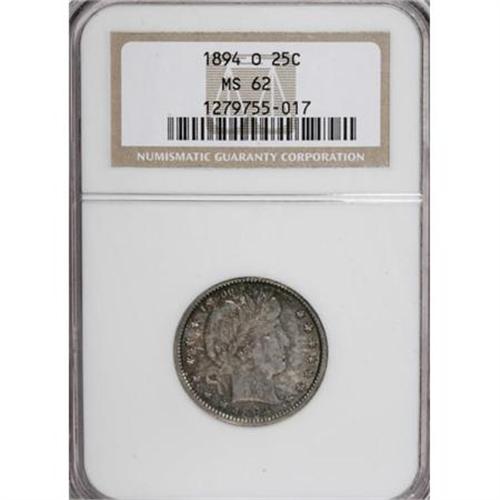<B>1894-O 25C MS62 NGC.</B></I> NGC Census: (16/62). PCGS Population (9/56). Mintage: 2,852,000. Numismedia Wsl. Price for NGC/PCGS coin in MS62: $510. (#5608)<BR><BR><B>Coin Engraver:</B> Charles E. Barber<BR><BR><b>Shipping:</b> Coins & Currency (<a target="_blank" href="http://www.heritageauctions.com/common/shipping.php">view shipping information</a>)