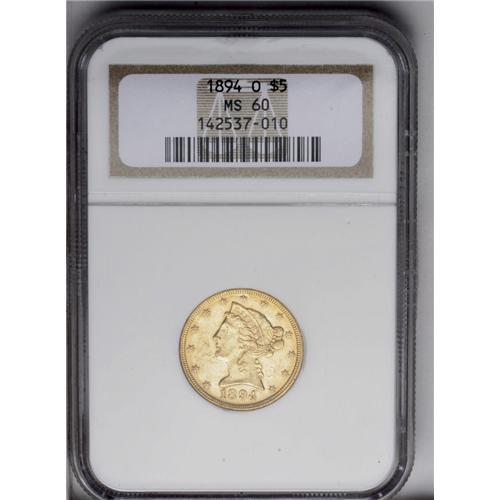 1894-O $5 MS60 NGC. A fully lustrous Mint State exampl 1894-O[$5] MS60 NGC.