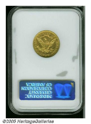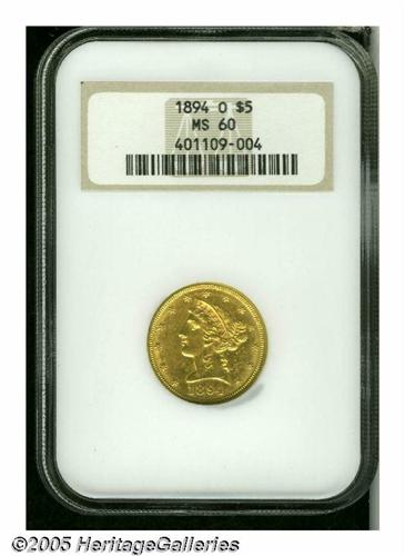 <B>1894-O<$5> MS60 NGC.</B></I> Some luster breaks are noted on this yellow-gold five dollar. Several small marks are scattered over each side, and the design elements are sharply struck. The low-mintage '94-O (16,600 pieces struck) is very scarce in all Uncirculated grades. Population: 24 in 60, 60 finer (5/05).