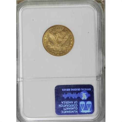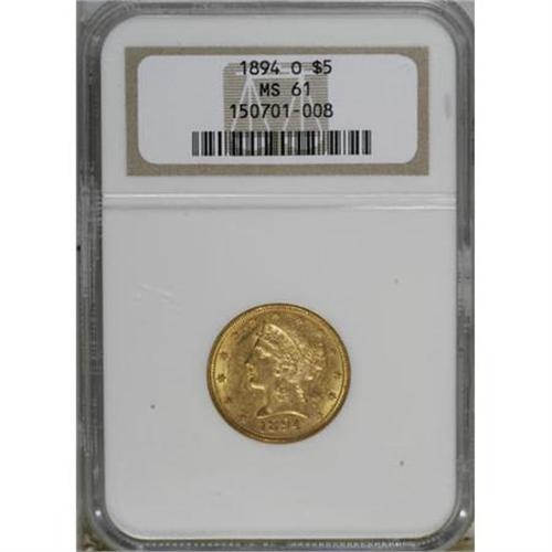 <B>1894-O $5 MS61 NGC.</B></I> Well struck for this New Orleans issue, though a touch of softness is noted on the central devices. Light to moderate abrasions on each side limit the grade, though the lustrous yellow-orange surfaces retain significant eye appeal. NGC has graded 15 finer pieces (1/08).<BR><BR><B>Coin Engraver:</B> Christian Gobrecht<BR><BR><b>Shipping:</b> Coins & Currency (<a target="_blank" href="http://www.heritageauctions.com/common/shipping.php">view shipping information</a>)