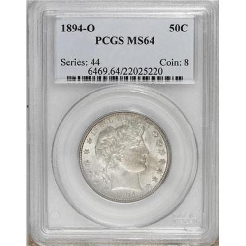 <B>1894-O 50C MS64 PCGS.</B></I> A satiny near-Gem with blended light tan and sky-blue toning. Probably worthy of a higher grade in terms of preservation, but the strike is somewhat soft on the fletchings and right shield corner. Population: 41 in 64, 16 finer (12/07).<BR><BR><B>Coin Engraver:</B> Charles E. Barber<BR><BR><b>Shipping:</b> Coins & Currency (<a target="_blank" href="http://www.heritageauctions.com/common/shipping.php">view shipping information</a>)