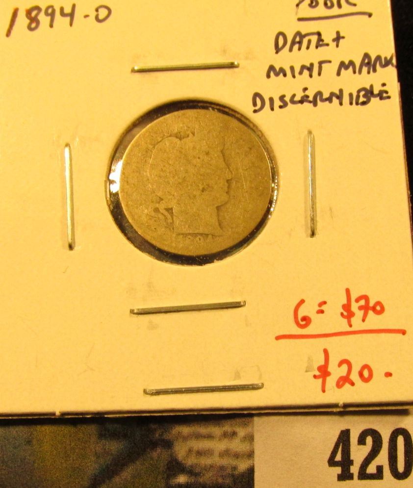 1894-O Barber Dime, Poor. Date and mint mark discernible, no damage, just worn, problem free G value $70, value $20