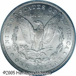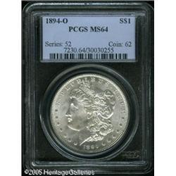 <B>1894-O<img border='0' src='http://www.heritagecoins.com/images/star.gif' width=10 height=10>$1 MS64 PCGS.</B></I> Struck during the reduced mintage years from 1893 to 1895, a greater percentage of '94-O Dollars saw extensive circulation than other New Orleans issues of this type. The relatively small quantities of Uncirculated pieces that exist today are almost always poorly struck and exhibit drab luster. Both the quality of strike and the intensity of luster on this fully untoned '94-O are outstanding for the issue, but there is still a touch of softness over the ear of Liberty. A couple of marks are noted on Liberty's cheek and hair, one is also present on the eagle's breast. Overall, this is a well preserved example of this conditionally scarce O-mint Dollar.<BR><I>From The Banks Collection.</B></I> Lot:10445