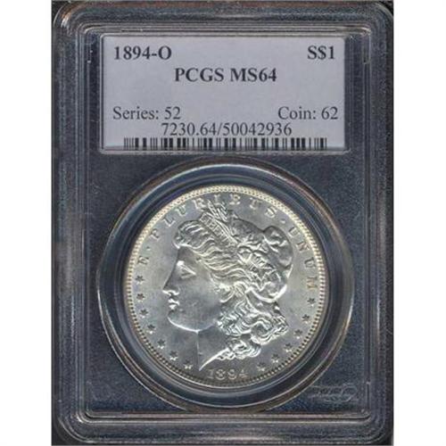 <b>1894-O Morgan Dollar. PCGS graded MS64.</b> The satin surfaces ripple with original white luster. The coin is untoned and silvery, and gleams with a beauty only rarely seen on an O-mint issue of 1894. The obverse only contact mark appears on the cheek to the right of the lips. The only reverse contact seems to be a slight nick on the second bundle of leaves under the right wing of the eagle (you might want to use magnification to find it). As to the design, there is only slight deviation in the sharp relief seen, mainly in the centers of the coin where the design failed to completely fill the dies as always. The eagle's wings are very bold with well defined feathers <b>(PCGS # 7230)</b>