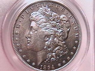 1894-O Morgan Dollar AU50 Clnd PCGS. Brilliant with generous lustre. The obverse shows some hairlines from a past cleaning. The pristine rev. is lustrous and sharp