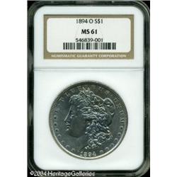 1894-O S$1 MS61 NGC. Bright surfaces have a chrome <B>1894-O S$1 MS61 NGC.</B></I> Bright surfaces have a chrome-steel appearance. Strike weakness is noted in the hair over Liberty's ear, and several small contact marks appear on Liberty's cheek and neck. <BR><BR><B>Important notice:</B> Heritage usually auctions material at the rate of 200-250 lots per hour. On some occasions eBay Live bid software or the Internet may not be able to keep up with the pace of the auction. We recommend placing a realistic absentee bid now as insurance to avoid disappointment. Occasionally the auctioneer may eliminate or reject an eBay Live bid, and the auctioneer may also reopen a lot after the close of the eBay live bidding (usually because we missed an audience bid), and may reject your bid even if it shows you as the winning bidder. By bidding via eBay Live, you agree that Heritage may award the lot to another bidder at its sole discretion under the circumstances described above or any other reasonable circumstances. Since eBay bids are not shown to us until we open the lot on the floor, we treat those bids just like floor bids. In most cases the floor responds before the eBay bid is presented to us, due to Internet lag time, so for consistency we have made it a policy that floor bids are always considered first over tie eBay live bids. Also please note that all Heritage lots purchased through eBay Live carry a 20% Buyer's Premium. Please make sure you read the Terms and Conditions before you bid. This lot is being auctioned in conjunction with a live floor auction by Heritage Galleries & Auctioneers. All final auction and invoice information will be supplied by Heritage Galleries & Auctioneers, and all other information should be considered preliminary. Lot:7658