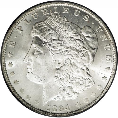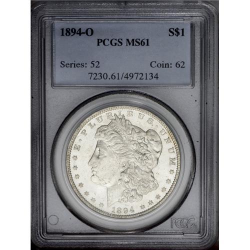 <B>1894-O<img border='0' src='http://www.heritagecoins.com/images/star.gif' width=10 height=10>$1> MS61 PCGS.</B></I> This brilliant and flashy example is typically struck in the centers, but the fields are cleaner and the luster is stronger than is usually encountered for the grade. Liberty's cheek and neck have noticeable contact marks. <BR><BR><B>Important notice:</B> Heritage usually auctions material at the rate of 200-250 lots per hour. On some occasions eBay Live bid software or the Internet may not be able to keep up with the pace of the auction. We recommend placing a realistic absentee bid now as insurance to avoid disappointment. Occasionally the auctioneer may eliminate or reject an eBay Live bid, and the auctioneer may also reopen a lot after the close of the eBay live bidding (usually because we missed an audience bid), and may reject your bid even if it shows you as the winning bidder. By bidding via eBay Live, you agree that Heritage may award the lot to another bidder at its sole discretion under the circumstances described above or any other reasonable circumstances. Since eBay bids are not shown to us until we open the lot on the floor, we treat those bids just like floor bids. In most cases the floor responds before the eBay bid is presented to us, due to Internet lag time, so for consistency we have made it a policy that floor bids are always considered first over tie eBay live bids. Also please note that all Heritage lots purchased through eBay Live carry a 20% Buyer's Premium. Please make sure you read the Terms and Conditions before you bid. This lot is being auctioned in conjunction with a live floor auction by Heritage Galleries & Auctioneers. All final auction and invoice information will be supplied by Heritage Galleries & Auctioneers, and all other information should be considered preliminary. Lot:3664 <BR><BR><B>Winning Notification and Billing:</B> After the FINAL session in this auction is complete, Heritage will send e-mail and snail mail invoices. This process normally takes several days. All final auction and invoice information will be supplied by Heritage Galleries & Auctioneers, and all other information should be considered preliminary. <BR><BR>This auction will be conducted on a live auction floor and over the Internet through eBay Live. If you choose to place an absentee bid, please take a moment to <font color='#0000ff'><u><a href='http://pages.ebay.com/liveauctions/help/before/laabsentee.html'>learn how eBay Live absentee bidding works</a></u></font><font color='#000000'>