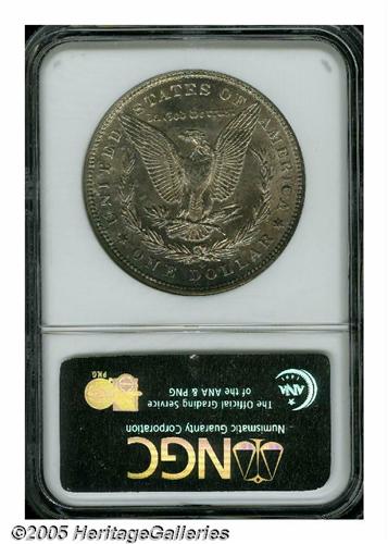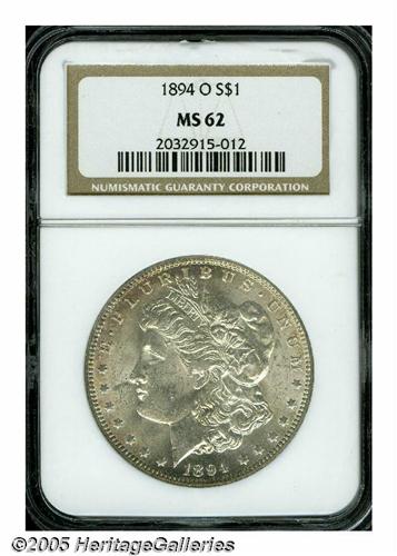 <B>1894-O<S$1> MS62 NGC.</B></I> Typically weak just above the ear, but well struck elsewhere, with rich, glowing luster, lovely champagne and sea-green toning over the reverse, and a bit of golden-russet patina near the upper left obverse rim. Nicely preserved, for the grade, but slightly scuffy on the cheek, and in the adjacent field area, with some scattered wispy marks on the reverse as well. A conditionally elusive issue, most of the mintage must have entered circulation rather than being kept as backing for Silver Certificates.<BR><I>From The Empire State Collection.</B></I>