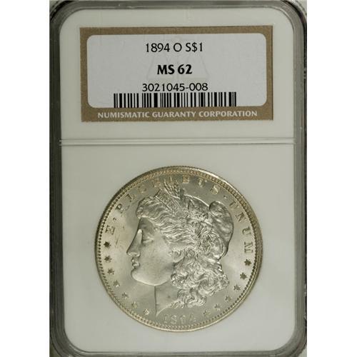 <B>1894-O S$1 MS62 NGC.</B></I> Well struck save for typical New Orleans weakness over the centers, with pleasing satin luster and essentially untoned surfaces. A shallow scrape extends beneath PLU. Otherwise, just a few wispy marks on the cheek and in the fields limit the grade. A visually pleasing example of this O-Mint issue.<BR><BR><b>Shipping:</b> Coin/Currency (<a target="_blank" href="http://www.heritageauctions.com/common/shipping.php">view shipping information</a>)