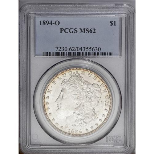 <B>1894-O<img border='0' src='http://www.heritagecoins.com/images/star.gif' width=10 height=10>$1 MS62 PCGS.</B></I> This lustrous and reasonably struck scarcer date dollar has only a hint of gold color at the borders. A light diagonal pinscratch on the cheek limits the grade.