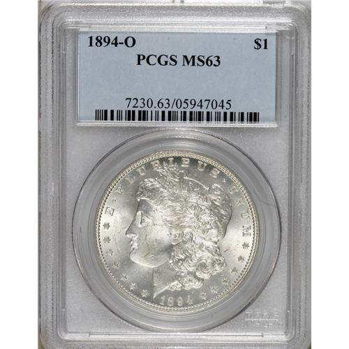 <B>1894-O S$1 MS63 PCGS.</B></I> Apparently most of the 1.72 million pieces struck of the 1894-O entered circulation as there are remarkably few Uncirculated coins known today. Those that are extant are always quickly absorbed by the collector market. This is a pleasing, satiny coin that is brilliant throughout. A few small marks on the cheek of Liberty explain the MS63 grade of this highly prized semi-key issue in the Morgan series.<BR><BR><b>Shipping:</b> Coins & Currency (<a target="_blank" href="http://www.heritageauctions.com/common/shipping.php">view shipping information</a>)