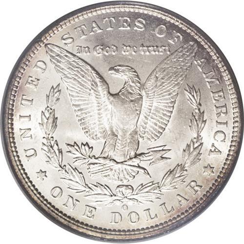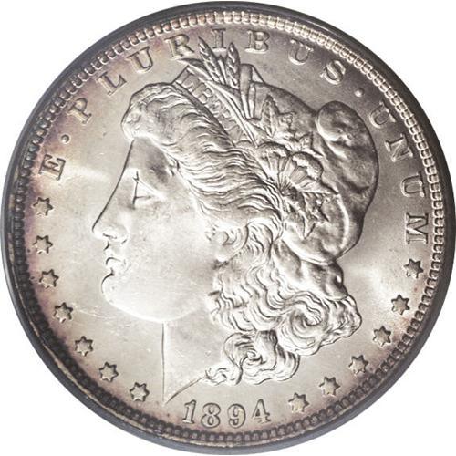 <B>1894-O<img border='0' src='http://www.heritagecoins.com/images/star.gif' width=10 height=10>$1> MS63 PCGS.</B></I> Mostly brilliant with some lilac-purple peripheral toning, and displaying some softness over Liberty's ear and on the eagle's breast. This is a conditionally scarce New Orleans date that is quite difficult to locate any finer.