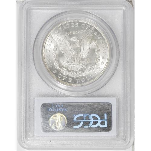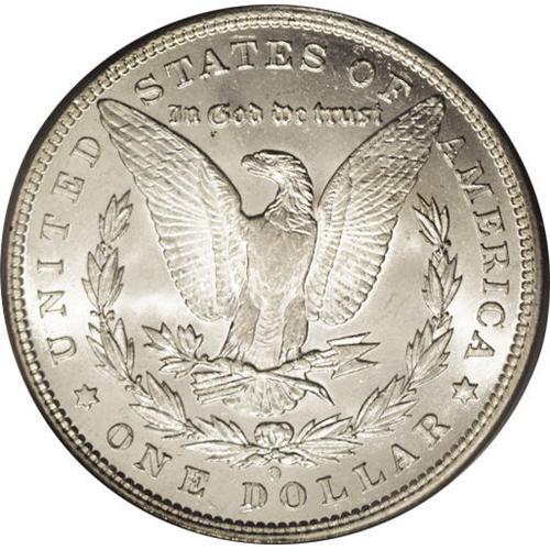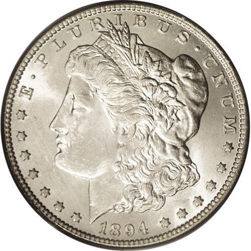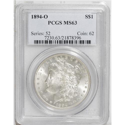 <B>1894-O<img border='0' src='http://www.heritagecoins.com/images/star.gif' width=10 height=10>$1> MS63 PCGS.</B></I> The 1894-O Morgan is seldom--perhaps never--found with both a sharp strike and brilliant, engaging luster. The luster on this piece is quite attractive, with a good cartwheel effect. The strike is typical on the hair above Liberty's ear, and fairly bold on the eagle's breast, where some detail is visible. All in all a delectable piece, with light, grade-consistent abrasions but good eye appeal.