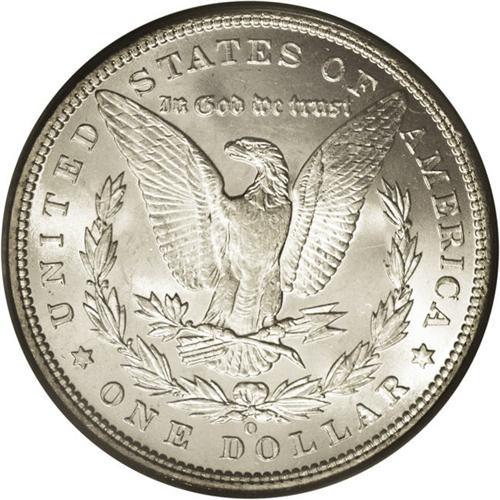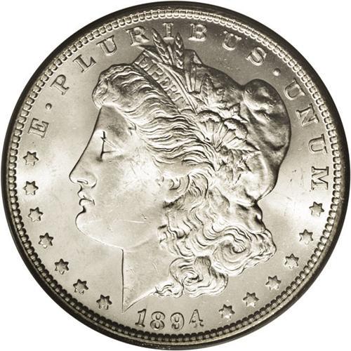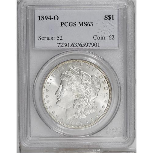 <B>1894-O<img border='0' src='http://www.heritagecoins.com/images/star.gif' width=10 height=10>$1> MS63 PCGS.</B></I> The satiny surfaces offer brilliant cartwheel luster, but the strike through the centers, while above average, is still far from sharp. The numerous light abrasions, mostly visible under a loupe, determine the grade, but the eye appeal is nonetheless high on this coveted issue.