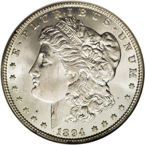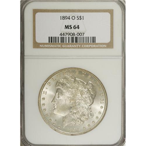 <B>1894-O S$1 MS64 NGC.</B></I> Bowers' <I>Guide Book of Morgan Silver Dollars</B></I> calls the 1894-O "wretched" in appearance. While this piece shows the usual soft strike through the centers, the radiant cartwheel luster and exuberant silver-white surfaces more than compensate. No singular abrasions are noted on either side, merely a few light, grade-consistent ticks. Attesting to this issue's rarity in high grades, NGC and PCGS combined have certified only 14 pieces finer (4/07).<BR><BR><b>Shipping:</b> Coins & Currency (<a target="_blank" href="http://www.heritageauctions.com/common/shipping.php">view shipping information</a>)