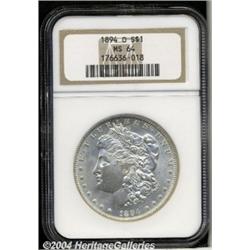 <B>1894-O<S$1> MS64 NGC.</B></I> A bit softly struck in the centers, the bright, satiny luster is brilliant except for the slightest hint of golden patina. A minimally abraded example of this rare, key date in the Morgan series. A couple of tiny diagonal marks are noted on the cheek that limit the grade. <BR><BR><B>Important notice:</B> Heritage usually auctions material at the rate of 200-250 lots per hour. On some occasions eBay Live bid software or the Internet may not be able to keep up with the pace of the auction. We recommend placing a realistic absentee bid now as insurance to avoid disappointment. Occasionally the auctioneer may eliminate or reject an eBay Live bid, and the auctioneer may also reopen a lot after the close of the eBay live bidding (usually because we missed an audience bid), and may reject your bid even if it shows you as the winning bidder. By bidding via eBay Live, you agree that Heritage may award the lot to another bidder at its sole discretion under the circumstances described above or any other reasonable circumstances. Since eBay bids are not shown to us until we open the lot on the floor, we treat those bids just like floor bids. In most cases the floor responds before the eBay bid is presented to us, due to Internet lag time, so for consistency we have made it a policy that floor bids are always considered first over tie eBay live bids. Also please note that all Heritage lots purchased through eBay Live carry a 20% Buyer's Premium. Please make sure you read the Terms and Conditions before you bid. </span></font></tr></table></td></tr></table>