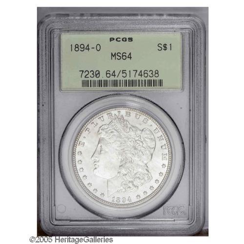 <B>1894-O<S$1> MS64 PCGS.</B></I> Fully brilliant surfaces exhibit a shimmering, satiny luster that is most appealing for this conditionally scarce issue. Typically softly struck over the ear of Liberty, and well defined on the eagle's breast, with only a few facial blemishes and scattered marks in the reverse fields. A minimally abraded example of this rare, key date in the Morgan dollar series. Gems are virtually unobtainable.