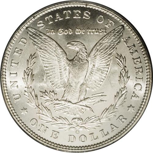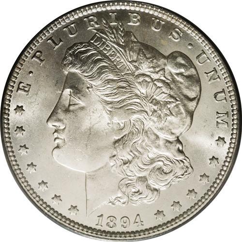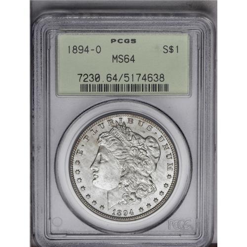<B>1894-O<img border='0' src='http://www.heritagecoins.com/images/star.gif' width=10 height=10>$1> MS64 PCGS.</B></I> Fully brilliant surfaces exhibit a shimmering, satiny luster that is most appealing for this conditionally scarce issue. Typically softly struck over the ear of Liberty, and well defined on the eagle's breast, with only a few facial blemishes and scattered marks in the reverse fields. A minimally abraded example of this rare, key date in the Morgan dollar series. Gems are virtually unobtainable.