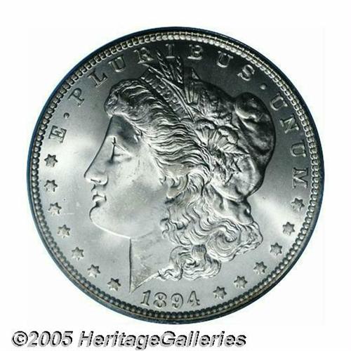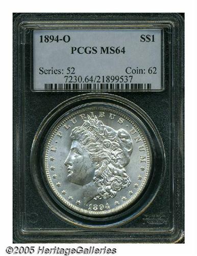 <B>1894-O<S$1> MS64 PCGS.</B></I> Satiny and untoned with exceedingly bright mint luster, being superior in this respect to the vast majority of Mint State survivors of this challenging O-mint issue. The strike is sharp overall although not quite full on the highest points. Contact marks are all small and unobtrusive, being confined to the left obverse field and cheek of Liberty in addition to the eagle's breast. Nearly unobtainable as a Gem, this example is about as nice as even the serious collector could hope to find. Population: 212 in 64, 8 finer (3/05).