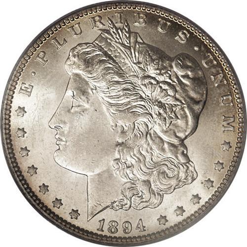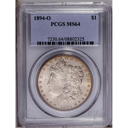 <B>1894-O<img border='0' src='http://www.heritagecoins.com/images/star.gif' width=10 height=10>$1> MS64 PCGS.</B></I> The difficulty is locating a high grade 1894-O starts with the fact that they are almost invariably poorly struck and since production was scaled back so dramatically in the previous year there was added demand to place them into circulation. Consequently, most survivors are well worn and even the occasional Mint State coin is marginal quality at best. Offered here is a happy exception to that theory. While not particularly well struck by the standards of other mints, for a New Orleans product the strike is more than adequate and shimmering, satiny luster is attractively framed in orange-gold peripheral toning. Only a few modest luster grazes are seen on Liberty's cheek and neck. Almost unobtainable as a Gem, so especially desirable quality for the issue. <BR><BR><B>Important notice:</B> Heritage usually auctions material at the rate of 200-250 lots per hour. On some occasions eBay Live bid software or the Internet may not be able to keep up with the pace of the auction. We recommend placing a realistic absentee bid now as insurance to avoid disappointment. Occasionally the auctioneer may eliminate or reject an eBay Live bid, and the auctioneer may also reopen a lot after the close of the eBay live bidding (usually because we missed an audience bid), and may reject your bid even if it shows you as the winning bidder. By bidding via eBay Live, you agree that Heritage may award the lot to another bidder at its sole discretion under the circumstances described above or any other reasonable circumstances. Since eBay bids are not shown to us until we open the lot on the floor, we treat those bids just like floor bids. In most cases the floor responds before the eBay bid is presented to us, due to Internet lag time, so for consistency we have made it a policy that floor bids are always considered first over tie eBay live bids. Also please note that all Heritage lots purchased through eBay Live carry a 20% Buyer's Premium. Please make sure you read the Terms and Conditions before you bid. This lot is being auctioned in conjunction with a live floor auction by Heritage Galleries & Auctioneers. All final auction and invoice information will be supplied by Heritage Galleries & Auctioneers, and all other information should be considered preliminary. Lot:3669 <BR><BR><B>Winning Notification and Billing:</B> After the FINAL session in this auction is complete, Heritage will send e-mail and snail mail invoices. This process normally takes several days. All final auction and invoice information will be supplied by Heritage Galleries & Auctioneers, and all other information should be considered preliminary. <BR><BR>This auction will be conducted on a live auction floor and over the Internet through eBay Live. If you choose to place an absentee bid, please take a moment to <font color='#0000ff'><u><a href='http://pages.ebay.com/liveauctions/help/before/laabsentee.html'>learn how eBay Live absentee bidding works</a></u></font><font color='#000000'>