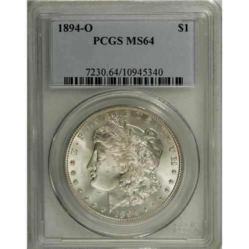 <B>1894-O S$1 MS64 PCGS.</B></I> This lovely better date Morgan dollar displays dashes of light tan-brown toning. Booming luster sweeps the unusually smooth surfaces. As usual for the 1894-O, the centers are incomplete, but the remainder of the design is crisp. A scant nine pieces have been certified finer by PCGS (11/06).<BR><BR><b>Shipping:</b> Coin/Currency (<a target="_blank" href="http://www.heritageauctions.com/common/shipping.php">view shipping information</a>)