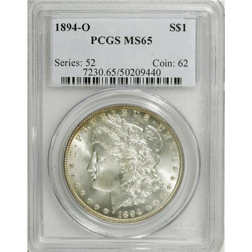 <B>1894-O S$1 MS65 PCGS.</B></I> This piece is a gorgeous Gem with brilliant silver surfaces that are accented by light peripheral gold color on each side. The central obverse and reverse are typically weak, especially over Liberty's ear and on the eagle's breast feathers. Essentially unblemished surfaces exhibit soft, frosty luster on both sides.<BR> The 1894-O dollar is one of the most important condition rarities in the series, with few Gem pieces certified by PCGS and none finer. Dave Bowers called this date "a cherrypicker's challenge and delight." He further commented: "A great deal of searching will be needed to find an example that is decent or above average (but not sharp) in striking details and with attractive luster."<BR> Today, there is great interest in high quality examples of this date, and most collectors understand the elusive nature of Gem or near-Gem specimens, although that was not always the case. The mintage was over 1.7 million coins, and an adequate supply of coins remained available into the 1960s, with many being unwanted due to the poor strike. Further from Bowers, in <I>A Guide Book of Morgan Silver Dollars:</B></I> "Although few accounts exist of Treasury payouts of 1894-O dollars, the variety was not in great demand, possibly because of the poor appearance of most pieces, and thus market levels were low through the 1940s. In the early 1950s several bags surfaces, giving dealers an adequate supply. More were part of the Treasury release of 1962 through 1964, but interest remained apathetic." Of course, all of this has changed today. Population: 9 in 65, 0 finer (2/07).<BR><I>From The Jackson Hole Collection.</B></I><BR><BR><b>Shipping:</b> Coins & Currency (<a target="_blank" href="http://www.heritageauctions.com/common/shipping.php">view shipping information</a>)