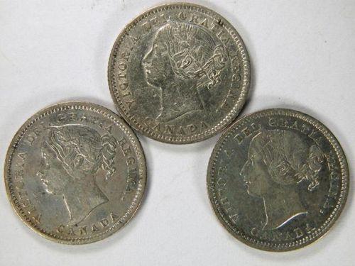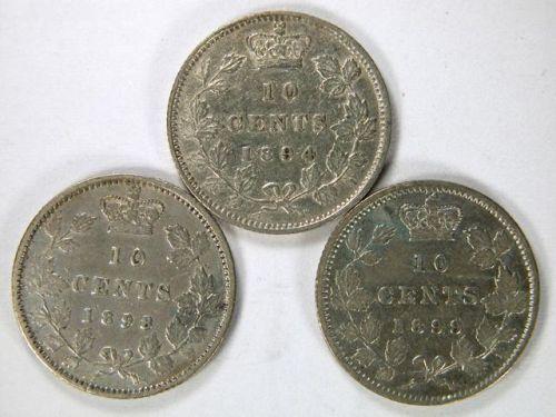 Canada Ten Cents 1894 Obverse 6, 1898 Obverse 6 and 1899 Small 99. Three pieces, all VF, the 1894 with minor scratches. Three pale toned pieces