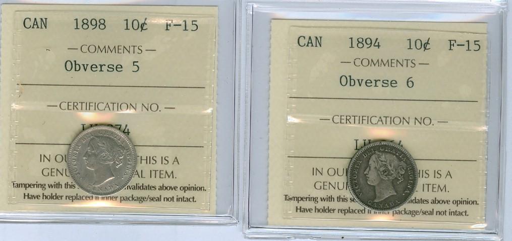 1894 Obv.6 and 1898 Obv.5 Lot of 2 ICCS graded 10¢ coins, both F15.