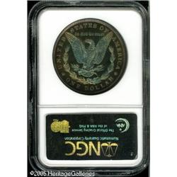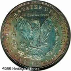 <B>1894<img border='0' src='http://www.heritagecoins.com/images/star.gif' width=10 height=10>$1 PR67 <img border='0' src='http://www.heritagecoins.com/images/star.gif' width=10 height=10> NGC.</B></I> Proof 1894 Silver Dollars are highly desirable because of the rarity of related business strikes. For the collector seeking a high numerical grade example of this date, the Proof version provides a less expensive alternative. This particular example is deeply toned with deep gold, lighter blue, and pale rose color on both sides. This is certified by NGC with their <img border='0' src='http://www.heritagecoins.com/images/star.gif' width=10 height=10> designation for exceptional eye appeal, a designation that it truly deserves. The devices have frosty luster beneath the toning which masks the cameo contrast. Only a few finer examples have been certified by NGC. Lot:10662
