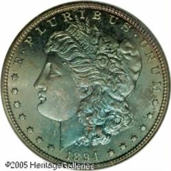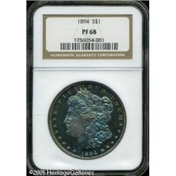 <B>1894<img border='0' src='http://www.heritagecoins.com/images/star.gif' width=10 height=10>$1 PR68 NGC.</B></I> This gorgeous 1890s proof possesses aesthetic allure that complements its superior technical quality. Both sides exhibit delicate electric-blue and rose iridescence at the center of the reverse. Every last hair strand and breast feather rises powerfully above the deeply mirrored fields of this powerfully impressed Morgan. With not even the most trivial hairline and/or contact mark to report, the surfaces are suggestive of an even higher grade assessment. Population: 12 in 68, 0 finer (1/05). Lot:10663