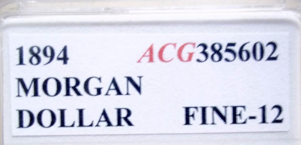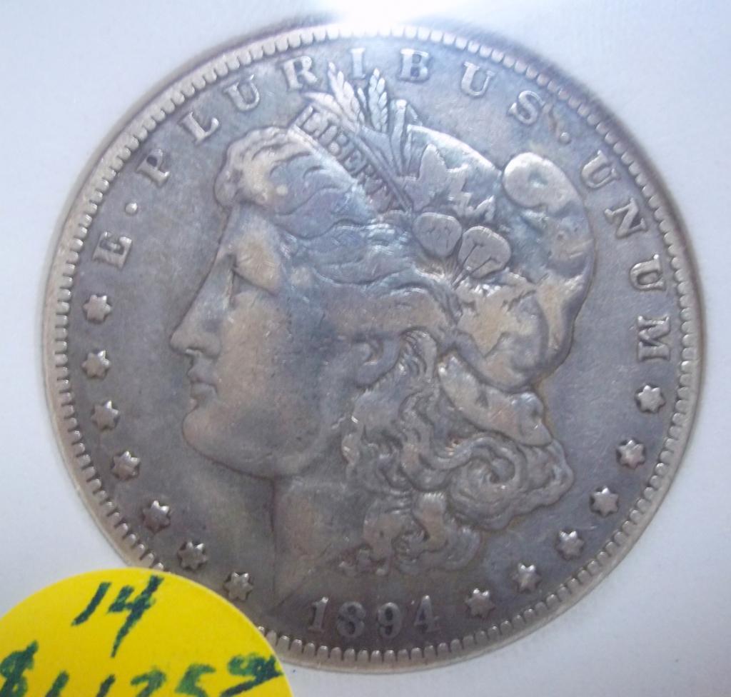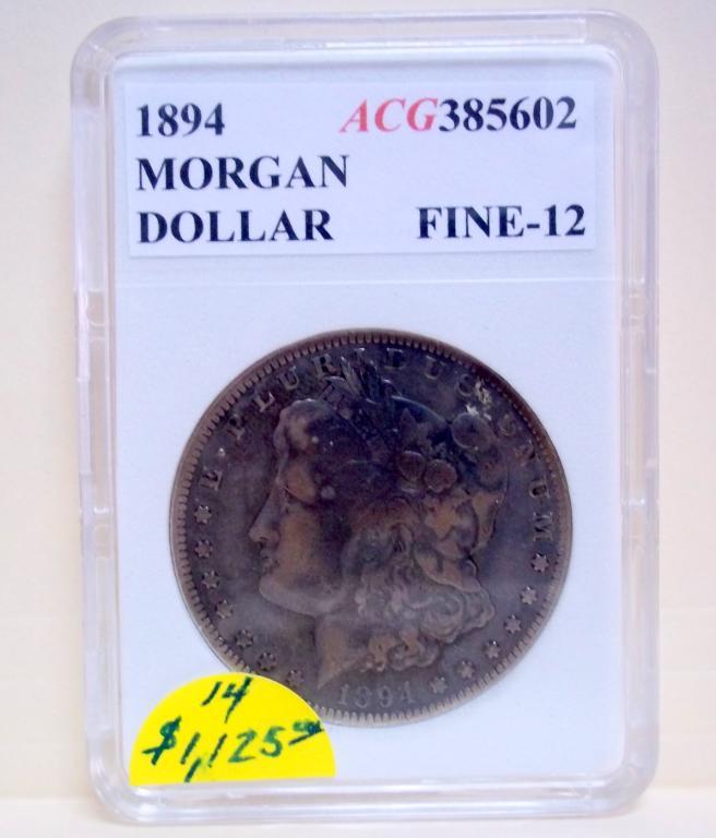 Key Date 1894 Philadelphia Mint Morgan Dollar ACCUGRADE certified Fine-12. A key date coin from the recently discovered ACCUGRADE hoard! This is a low mintage coin with only 110,972 coins produced!