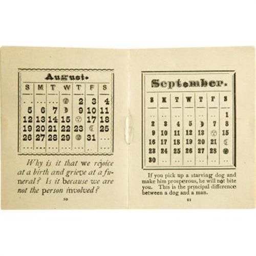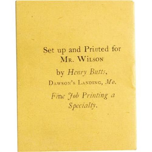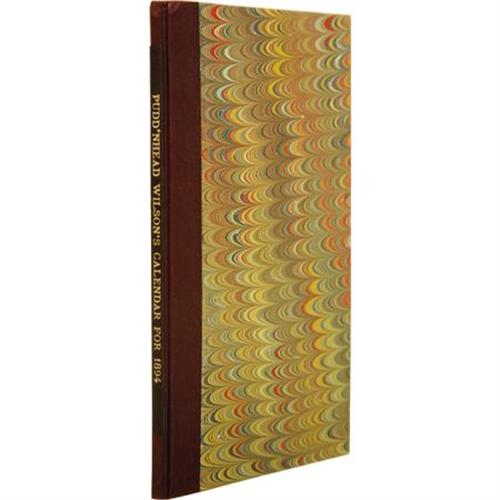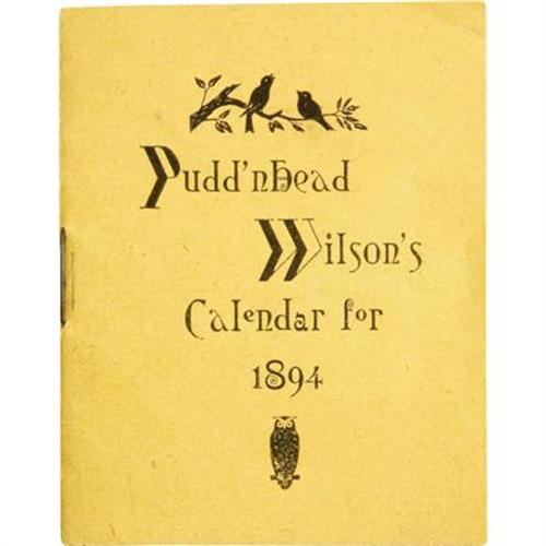 <B> Mark Twain Tiny 1894 Promotional Calendar for Mark Twain's Serialized Novel, </B></I><I>Pudd'nhead Wilson.</B></I> Staple-bound in buff yellow wrappers. Twain's comic detective story was serialized in seven installments between 1893 and 1894 in New York's <I>The Century Magazine.</B></I> The magazine created this 2.25" x 3" calendar as a unique promotional ploy to introduce readers to Twain's newest Mississippi River tale, and often passed it out at newsstands. Titled "Pudd'nhead Wilson's Calendar for 1894," this small pamphlet begins with a short piece on finger prints, a salient plot device in <I>Pudd'nhead Wilson,</B></I> and one of the first times finger prints were used in a detective story. Following this is a monthly calendar of 1894 with one of Wilson's maxims printed beneath each month. For example, under August can be read "Why is it that we rejoice at a birth and grieve at a funeral? Is it because we are not the person involved?" The calendar concludes with a two page advertisement for the upcoming <I>Pudd'nhead Wilson</B></I> installments in <I>Century,</B></I> a picture of Twain on the inside of the back cover, and the notice on the back cover that this tiny calendar was "Set up and Printed for Mr. Wilson by Henry Butts, Dawson's Landing, MO. Fine Job Printing a Specialty." A number of these calendars were printed, and greatly assisted <I>Century</B></I> in selling <I>Pudd'nhead Wilson</B></I> to their readers. They are extremely rare today, however, especially in as fine condition as this example, which appears virtually uncirculated. The tiny pamphlet comes housed in a custom slipcase with marbled paper boards, shelf-backed in crimson cloth, with gilt lettering on the spine. "Pudd'nhead Wilson's Calendar for 1894" is a unique paper collectible, essential for any Twain fan or completist or serious ephemera collector.<BR><BR><b>Shipping:</b> Books & Catalogs (<a target="_blank" href="http://www.heritageauctions.com/common/shipping.php">view shipping information</a>)