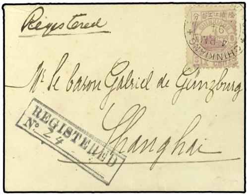 1894 Registered envelope to Shanghai franked local 6c. tied by Postal Service cds. On reverse similar cds + blue Shanghai Local Post arrival cds. Obverse bears large boxed ´Registered´ handstamp. V. fine.