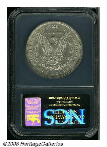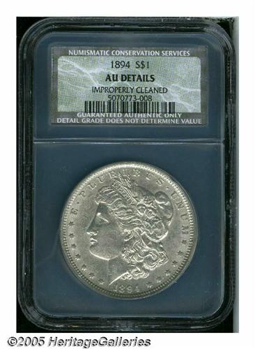 <B>1894<S$1> AU Details, Improperly Cleaned, NCS.</B></I> Untoned and slightly bright from a mild cleaning, this rare date Dollar also has a moderate rim mark at 1:30 accompanied by faint file marks. Substantial luster gleams from the borders and devices.