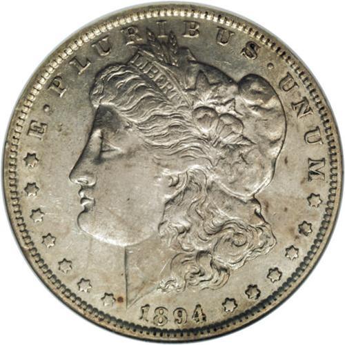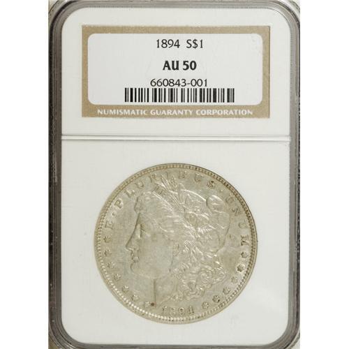 <B>1894 S$1 AU50 NGC.</B></I> About half of the luster is still present, although it is somewhat cloudy, with a light layer of gray-gold patina. A few moderate abrasions are noted under a loupe, but this key-date coin--the first low-mintage P-mint issue with an emission of just 110,000 pieces--retains its appeal.<BR><BR><b>Shipping:</b> Coins & Currency (<a target="_blank" href="http://www.heritageauctions.com/common/shipping.php">view shipping information</a>)