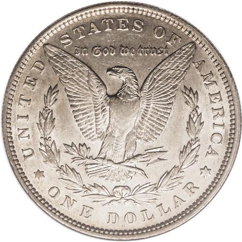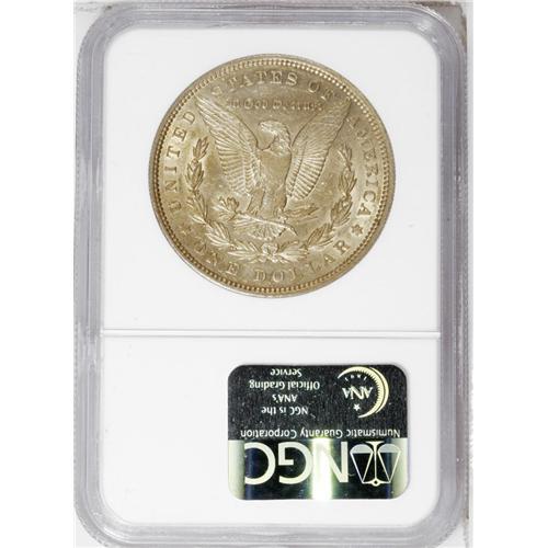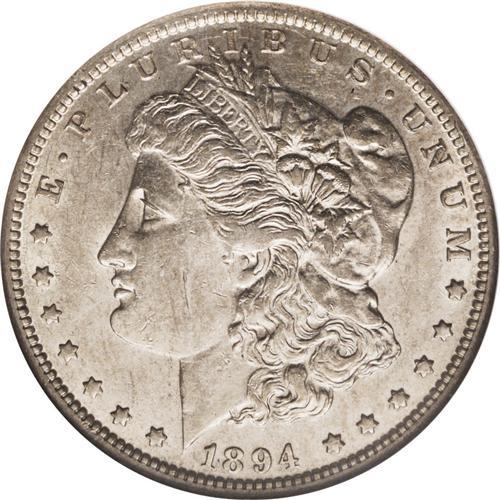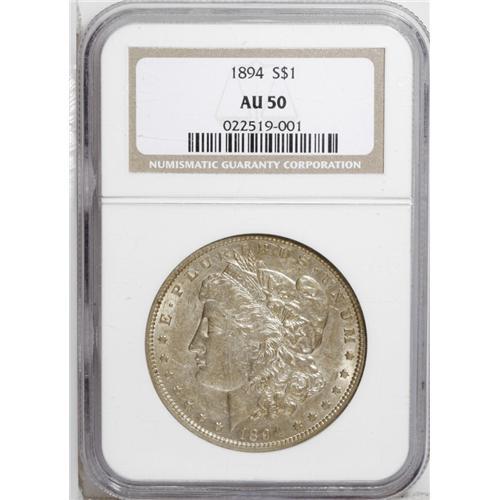 <B>1894<img border='0' src='http://www.heritagecoins.com/images/star.gif' width=10 height=10>$1> AU50 NGC.</B></I> The Morgan dollar series has its share of low-mintage issues, but the 1894 ranks among the scarcest with a mintage of just 110,972 pieces. This olive-gold piece is a fine representative, with minor wear on the highpoints but largely unaffected and still-lustrous fields. The small handling marks on each side have little impact on the overall eye appeal.