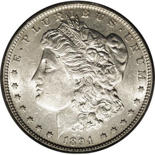 <B>1894<img border='0' src='http://www.heritagecoins.com/images/star.gif' width=10 height=10>$1> AU50 PCGS.</B></I> This low mintage Choice AU 1894 dollar representative retains considerable luster on silver-gray surfaces that are visited by whispers of light tan color, which is somewhat more extensive and deeper on the reverse. Nice definition is evident on the design features, with some detail showing in the hair over Liberty's ear and on the eagle's breast. Minute contact marks are scattered over the obverse.